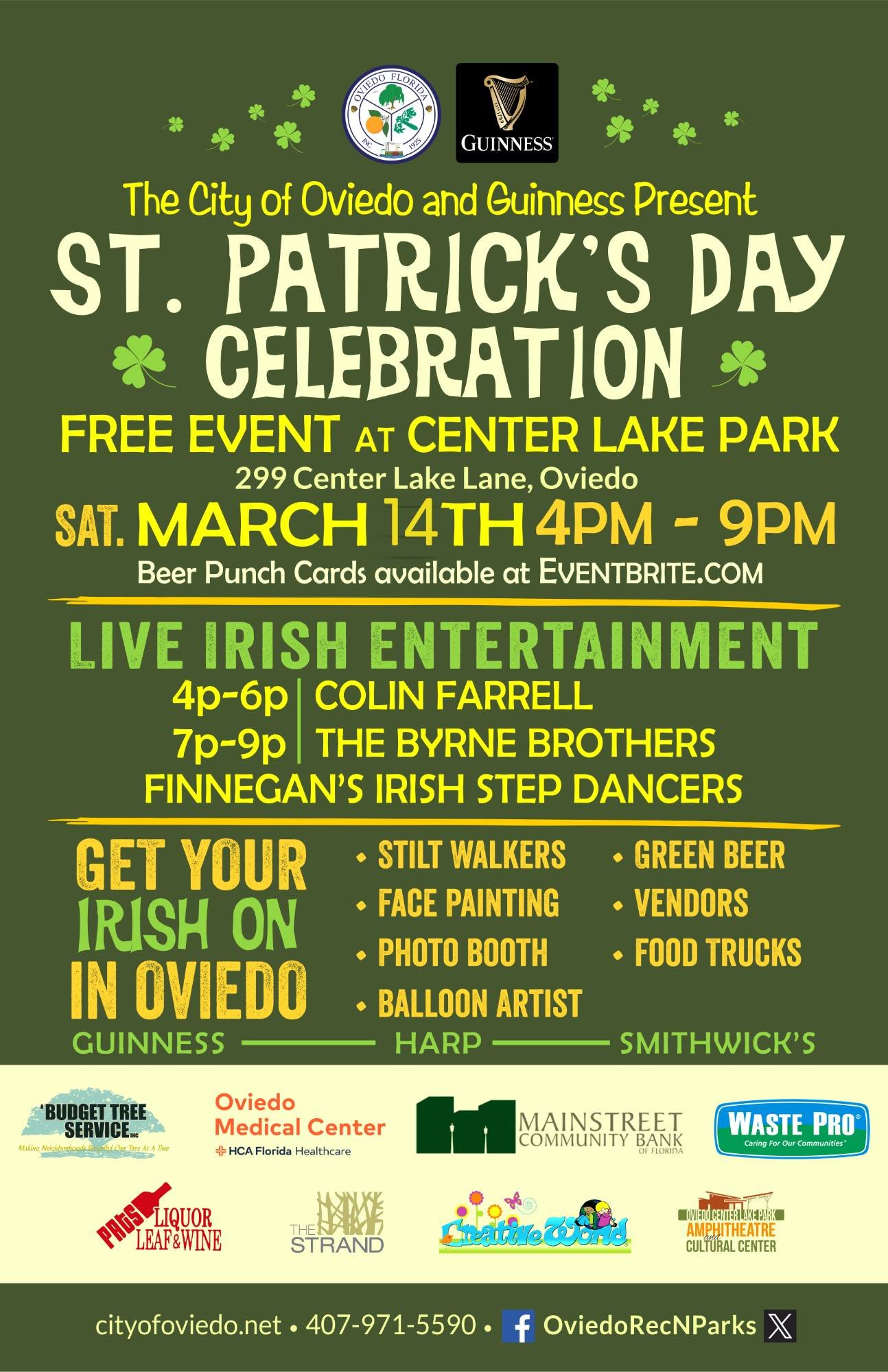 But that doesn’t mean we can’t host some great St Patrick’s Day festivities! The city of Oviedo is hosting a St Patrick’s Day festival. It’s at Oviedo on the Park - a quaint town center community if you’ve never seen it! The festival will feature live music, food trucks and other sales vendors, and more!